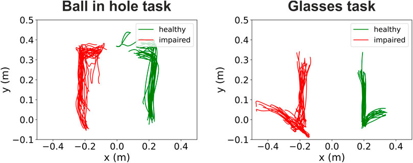 Example of hand trajectories recorded during task execution. The two panels show the hand trajectories of a 77-year old male patient during the execution of the “ball in hole” (left panel) and “glasses” (right panel) tasks. This patient exhibited a left side impairment. The trajectories of the healthy and impaired hands are shown in green and red respectively.Research & Scientific Publications